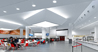 No daylight enters the spaciously designed cafeteria of the University, which is also the core get-together venue for the students between classes. The importance was to create the feeling of natural daylight streaming through the room to enhance wellbeing and energize the students. A tailor-made lighting solution of 3 skylights meets exactly those needs. Fluorescent lamps provide a balanced solution with warm and cold colour temperatures under a cove. The intelligent lighting control system adjusts intensity and color of light according to the actual day time. This solution allows setting as many different scenes as required and is able to simulate any time of day as well as seasons.