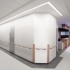 Even in the operating theatres and patient rooms, one is surprised to find the ceilings painted in yellow and the walls subtly decorated. In order to meet the high requirements in terms of hygiene and lighting quality, CLEAN Supreme cleanroom luminaires have been installed in the operating theatres and CLEAN Advanced luminaires in the intensive care ward – in each case featuring IP 65/54 protection, state-of-the-art T16 lamp technologies and electronic ballasts. In the intensive care ward, dimmable TECTON TETRIS luminaires are used as well. For patients confined to bed in particular, they create a pleasant atmosphere without any glare. The PURELINE luminaires used in the patient rooms, which combine indirect room lighting and direct light for reading, meet all requirements in terms of home-like, yet medically safe lighting. A simple press of a button is required to switch from general lighting or reading light to visually exacting examination lighting at 300 lux.