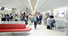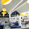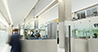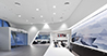 Administrative and prestigious areas provide a complete contrast in lighting terms: SCONFINE Linea pendant luminaires, PANOS Q downlights and SLOTLIGHT light lines arranged in a rectangle welcome visitors into an exciting lighting ensemble. Controlled by the LUXMATE Emotion lighting management system, pre-programmed lighting scenarios can be run at the press of a button. Recessed MELLOW LIGHT IV luminaires and KAREA free-standing luminaires conjure up a lighting scene that is similar to daylight in office areas with a pleasant ratio of direct to indirect light that ensures optimal glare-free working conditions. The gentle light from SCONFINE Linea pendant luminaires produces a calm, relaxing atmosphere in the canteen. Large reflective areas provided by suspended curved elements emphasise the pleasant lighting effect achieved.