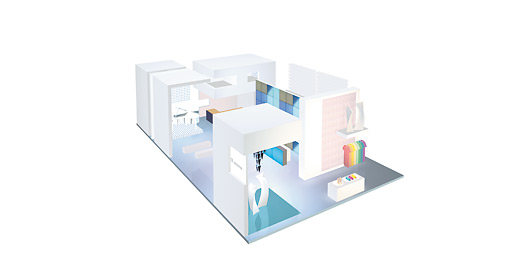 With its stylish façades, shop windows and entrance areas, the stand suggests a typical shopping situation already from the outside. Even the interplay of shop window lighting and daylight is simulated realistically by an LED luminous ceiling. The surface areas of the trade fair stand exhibit a very pared-down design featuring purist white and grey tones, fully directing the visitors’ attention onto the exhibits and lighting experiences created. It is only in the evening that dynamic lighting scenarios turn the Zumtobel stand into an impressive stage, where a specially developed multimedia performance is presented – an inspiration to both eyes and ears.